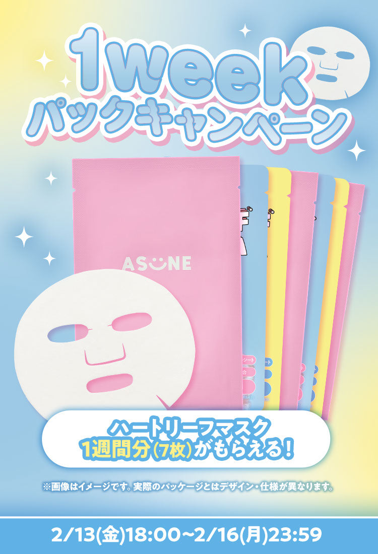 🩵1週間分うるおいチャージ🩵 最大5,400円相当が貰える!✨期間限定⚡でASUNEのハートリーフマスクがもらえるイベントが開催✨ ⏰イベント期間⏰ 2026年2月13日(金)18時~16日(月)23時59分 ━━━━━━━━━━━━━━🛒7,000円(税込)以上ご購入でシートマスク7枚プレゼント🫧✨(約2,700円相当) さらに+3,000円で…! 🛒10,000円(税込)以上ご購入で+7枚追加!合計14枚プレゼント🫧✨(約5,400円相当)━━━━━━━━━━━━━━ まとめ買いするほどおトクなイベント🉐💨今すぐ公式オンラインストアをチェック!💙 ※プレゼントは、送料を除いた金額で対象金額以上購入者が対象となります。※本イベントは、送料無料クーポン及びショッピングポイントなどあらゆる割引の適用対象外となりますのでご注意ください。※クーポンを使用した場合、本イベントのプレゼントが適用対象外となりますのでご注意ください。